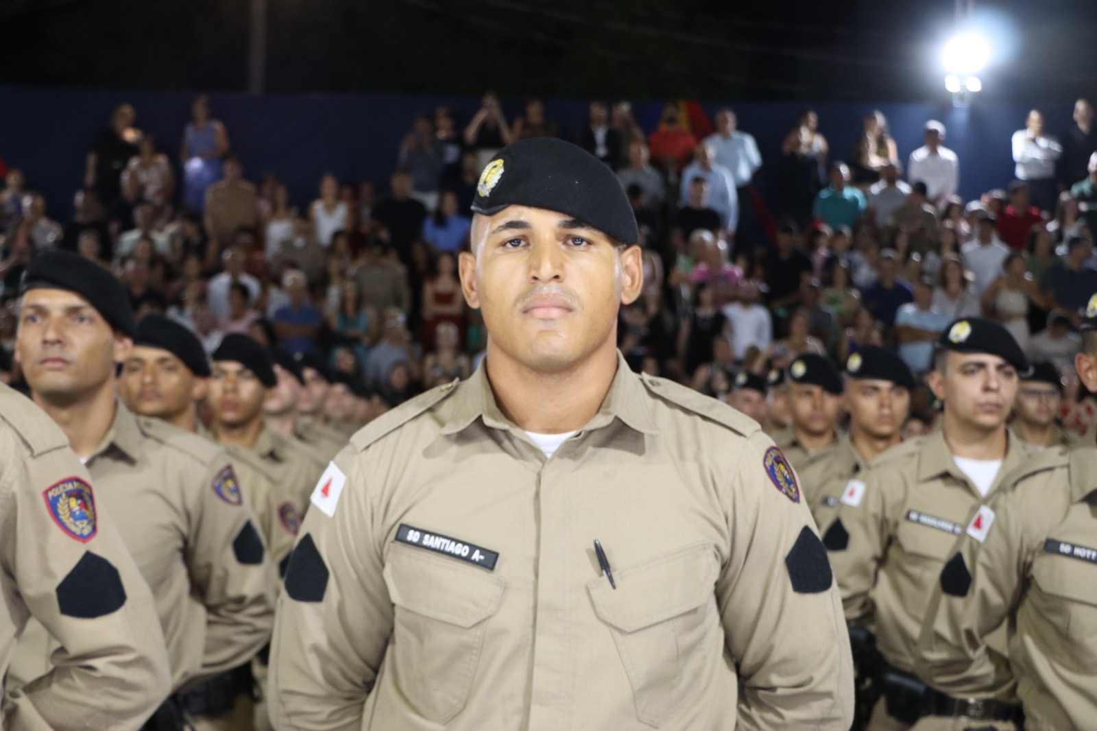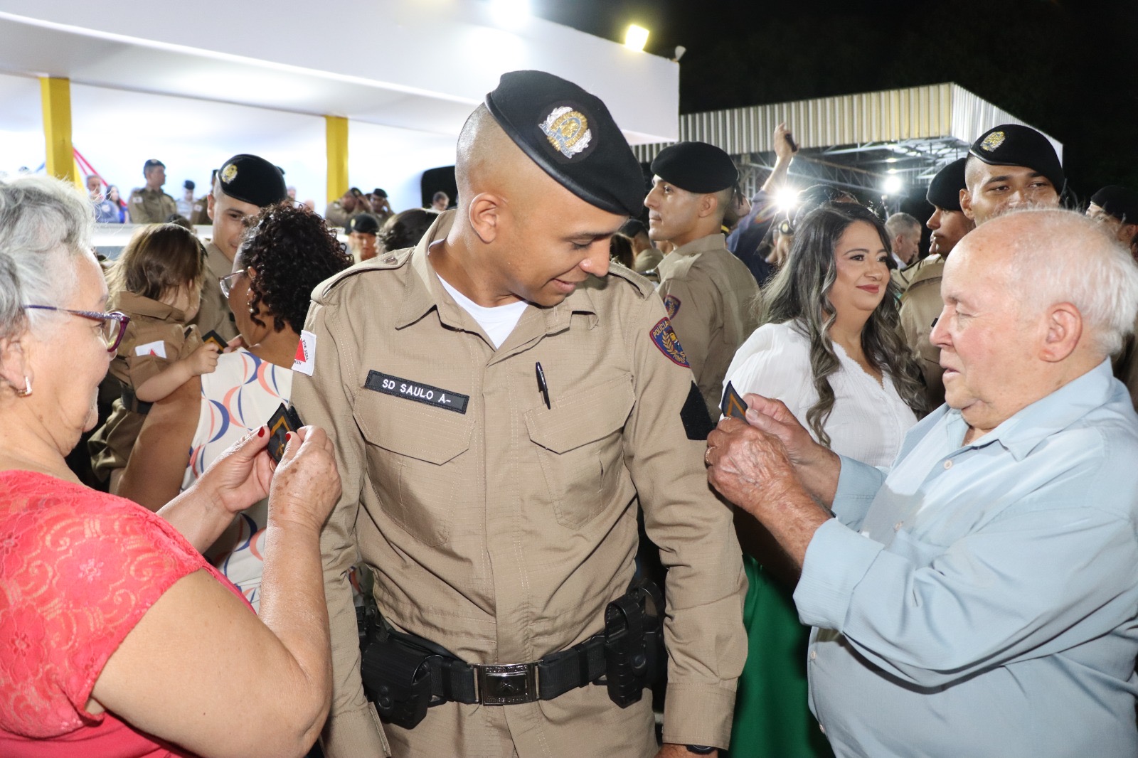 O momento mais aguardado da noite foi a aposição das divisas de Soldados de Primeira Classe aos formandos, marcando oficialmente sua entrada nas fileiras da corporação.