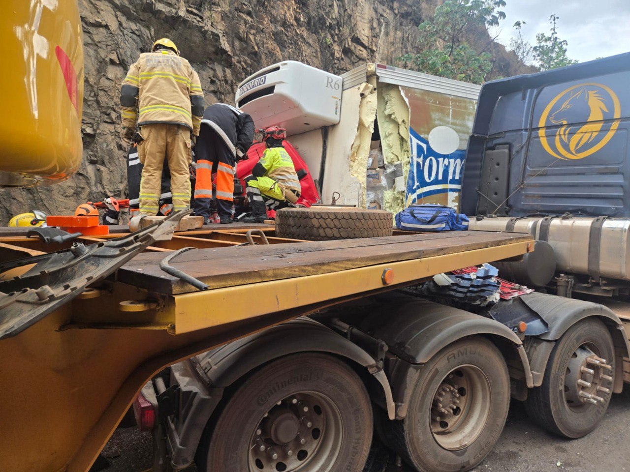 Equipes do Corpo de Bombeiros e do SAMU (USA) foram acionadas. Os militares realizaram o desencarceramento da vítima, um homem de aproximadamente 40 anos, que ficou preso pelas pernas às ferragens da cabine do caminhão baú. Ele estava consciente e orientado no momento do resgate e foi encaminhado ao Hospital João XXIII.