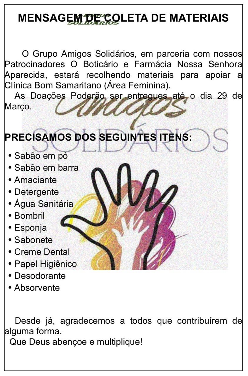 A solidariedade pode começar com atitudes simples — e é com esse propósito que o Grupo Amigos Solidários promove a campanha “Cuidar é Amar”, voltada à arrecadação de materiais de higiene pessoal para a Clínica de Reabilitação Bom Samaritano.