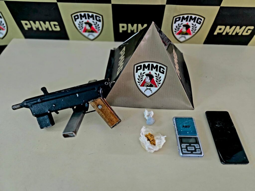 Com autorização, os militares realizaram buscas no imóvel, onde localizaram uma submetralhadora artesanal calibre .380, além de uma porção de crack, uma bucha de maconha e uma balança de precisão.