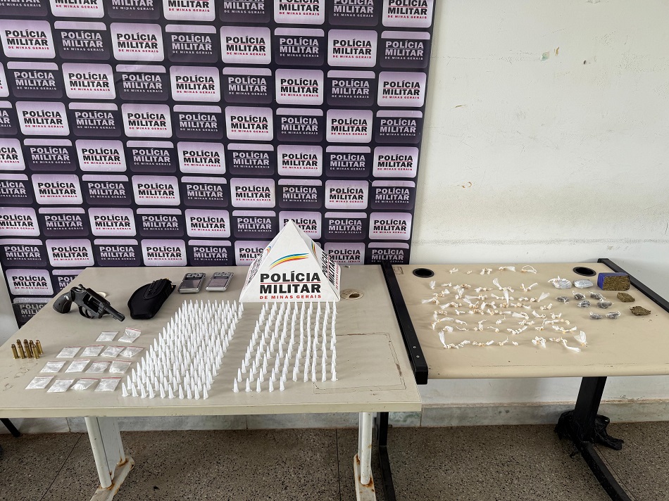 Durante operação policial no Bairro Fênix, em Itabira nessa segunda-feira (22), guarnições da Polícia Militar, apreenderam um revólver .38 e oito cartuchos intactos do mesmo calibre, 285 pinos de cocaína; 14 papelotes de cocaína; 153 pedras de crack; 10 buchas de maconha e um tablete da droga, duas balanças de precisão e uma sacola cheia de pinos vazios.