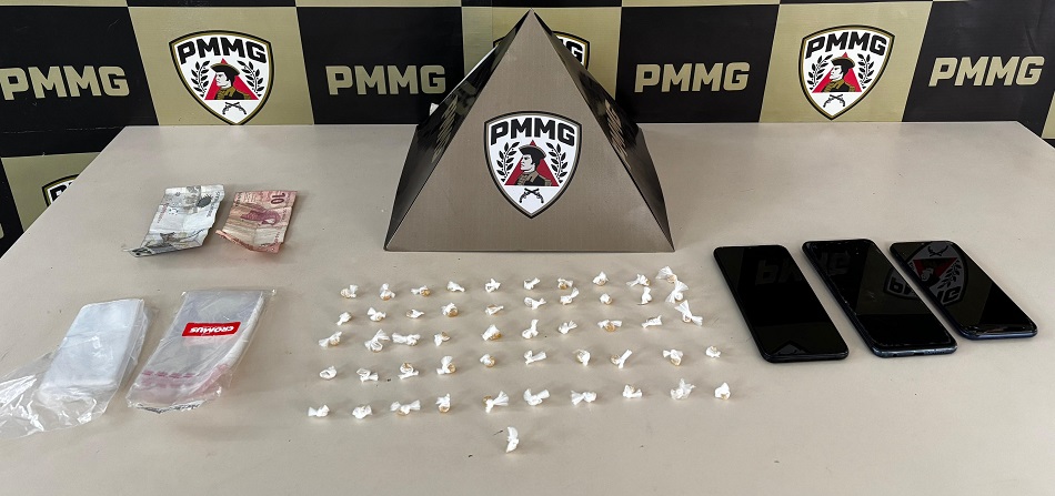 No local, foram apreendidas 56 pedras de crack, dinheiro em espécie, telefones celulares e materiais utilizados para o preparo e a comercialização de entorpecentes, como plásticos para embalagem e uma tesoura.