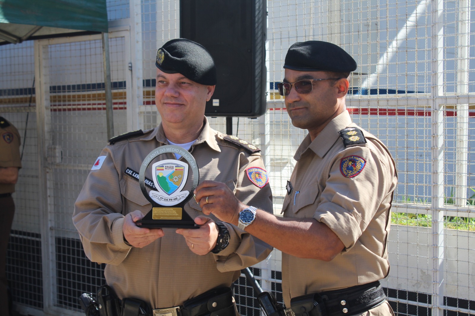 O coronel Juliano Fábio Lemos Dias, recebeu das mãos do comandante Edivaldo Ramos Fernandes, o “Troféu Vigilante do Médio Piracicaba” em agradecimento ao apoio para com a Unidade.