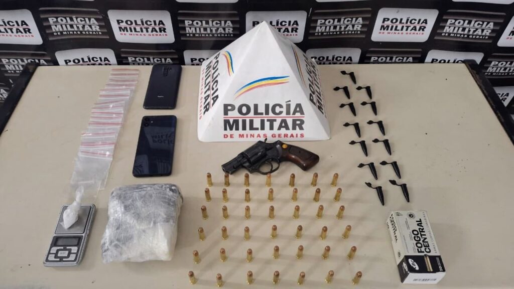 Durante a abordagem, os militares encontraram na cintura do autor um revólver calibre .38 carregado com cinco munições. Em continuidade às diligências, foram apreendidas 42 munições do mesmo calibre, uma barra e uma porção de cocaína, dois celulares, uma balança de precisão, além de embalagens plásticas e pinos vazios utilizados para acondicionamento de drogas.