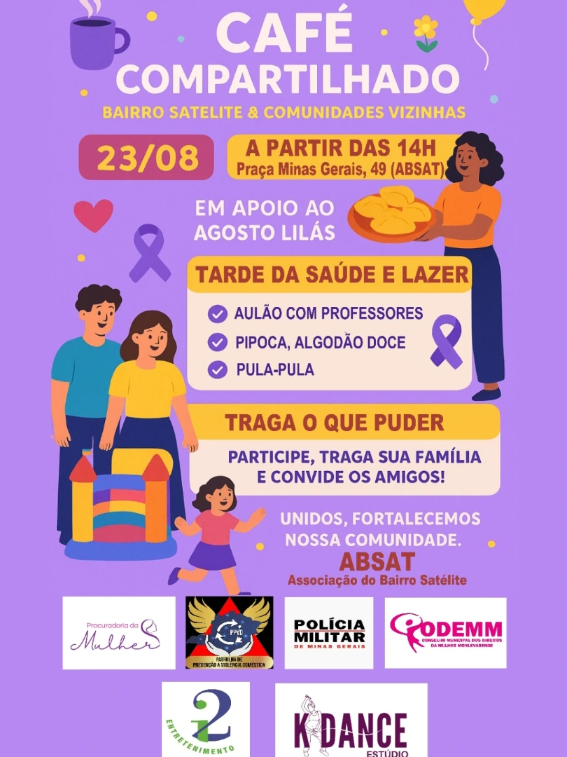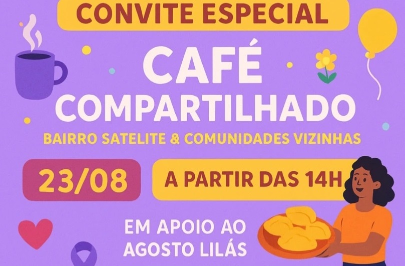 Neste sábado (23), a partir das 14h, a Praça do Redondo, será palco do Café Compartilhado, promovido pela Associação do Bairro Satélite (ABSAT), evento que une lazer, cultura e conscientização no marco da campanha Agosto Lilás, de combate à violência contra a mulher.