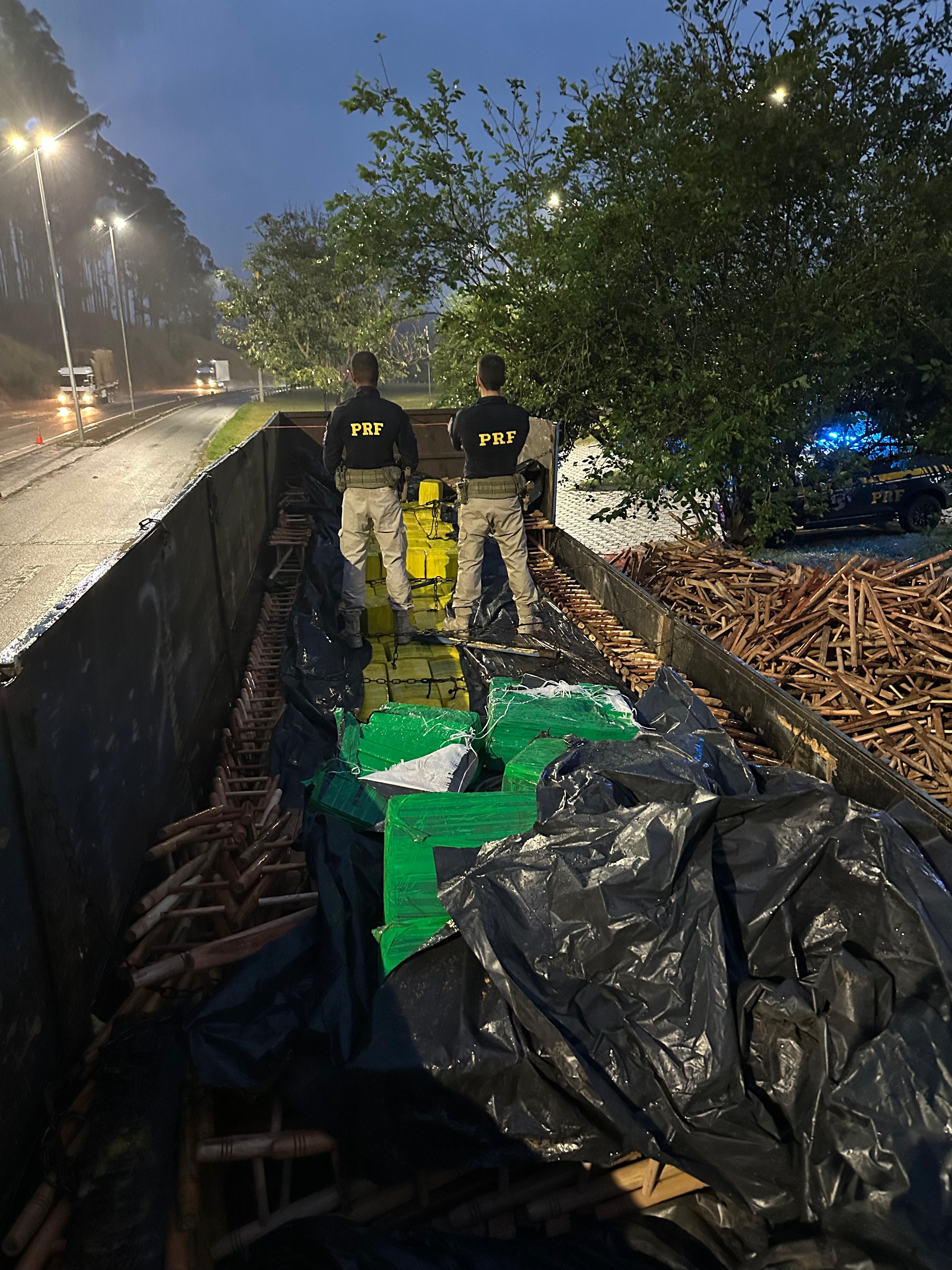 Debaixo do carregamento de banquetas a equipe da PRF acabou por localizar diversos fardos com tabletes de Maconha, escondidos debaixo de uma lona preta. No total foram apreendidos 5,4 toneladas de Maconha.O motorista, quando questionado, afirmou que receberia R$ 15.000,00 para transportar a droga de Coronel Sapucaia (MS) até a cidade de Betim (MG).