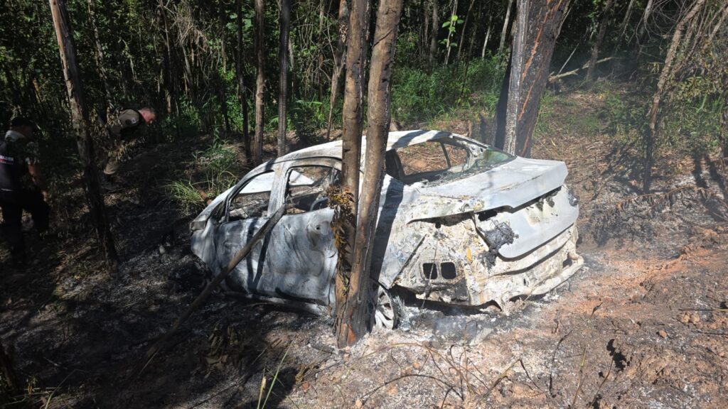 Durante as diligências, os militares conseguiram localizar o veículo utilizado na ação criminosa no município de São Gonçalo do Rio Abaixo. O automóvel foi encontrado incendiado, o que levanta a suspeita de tentativa de eliminar provas.